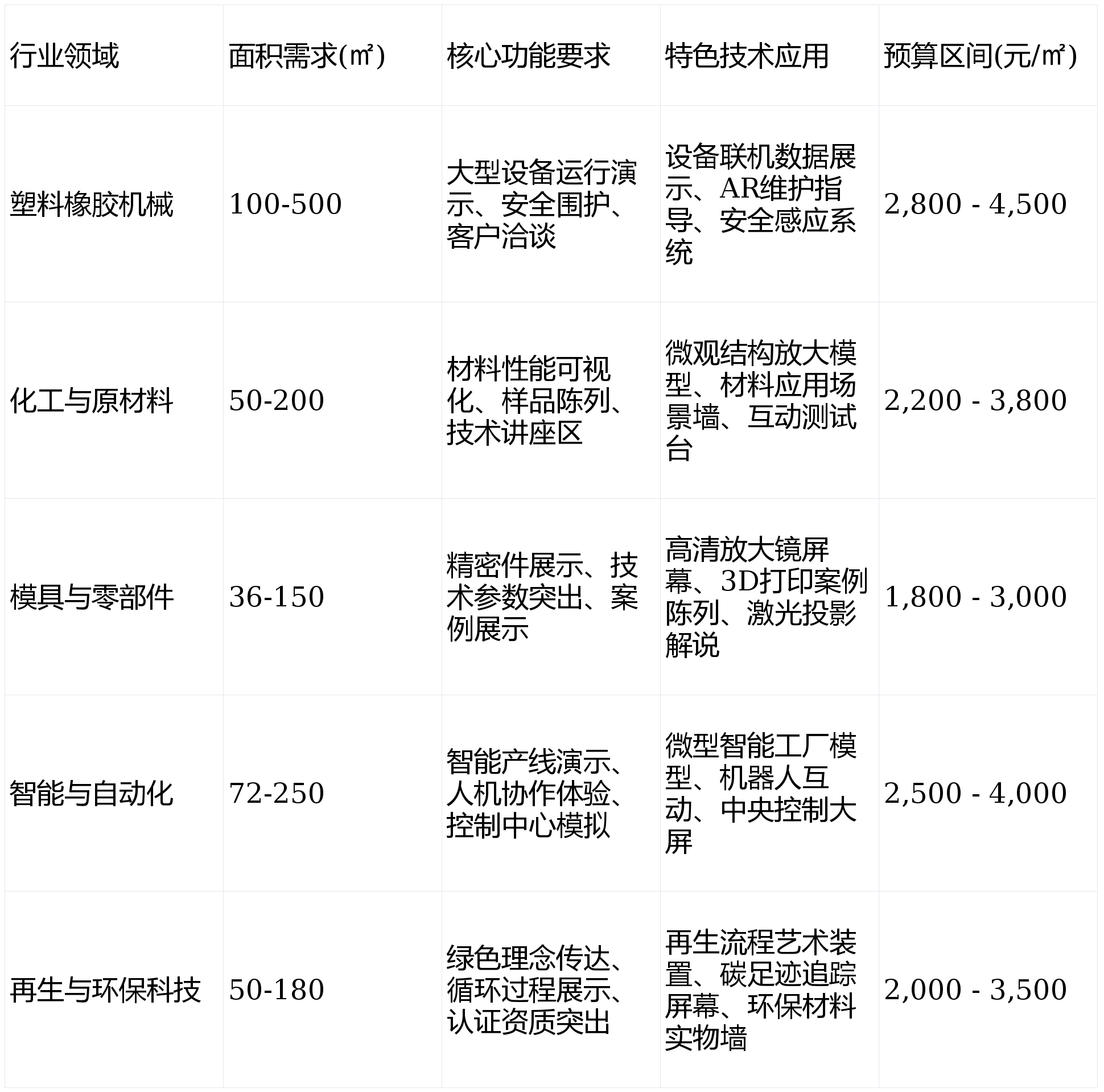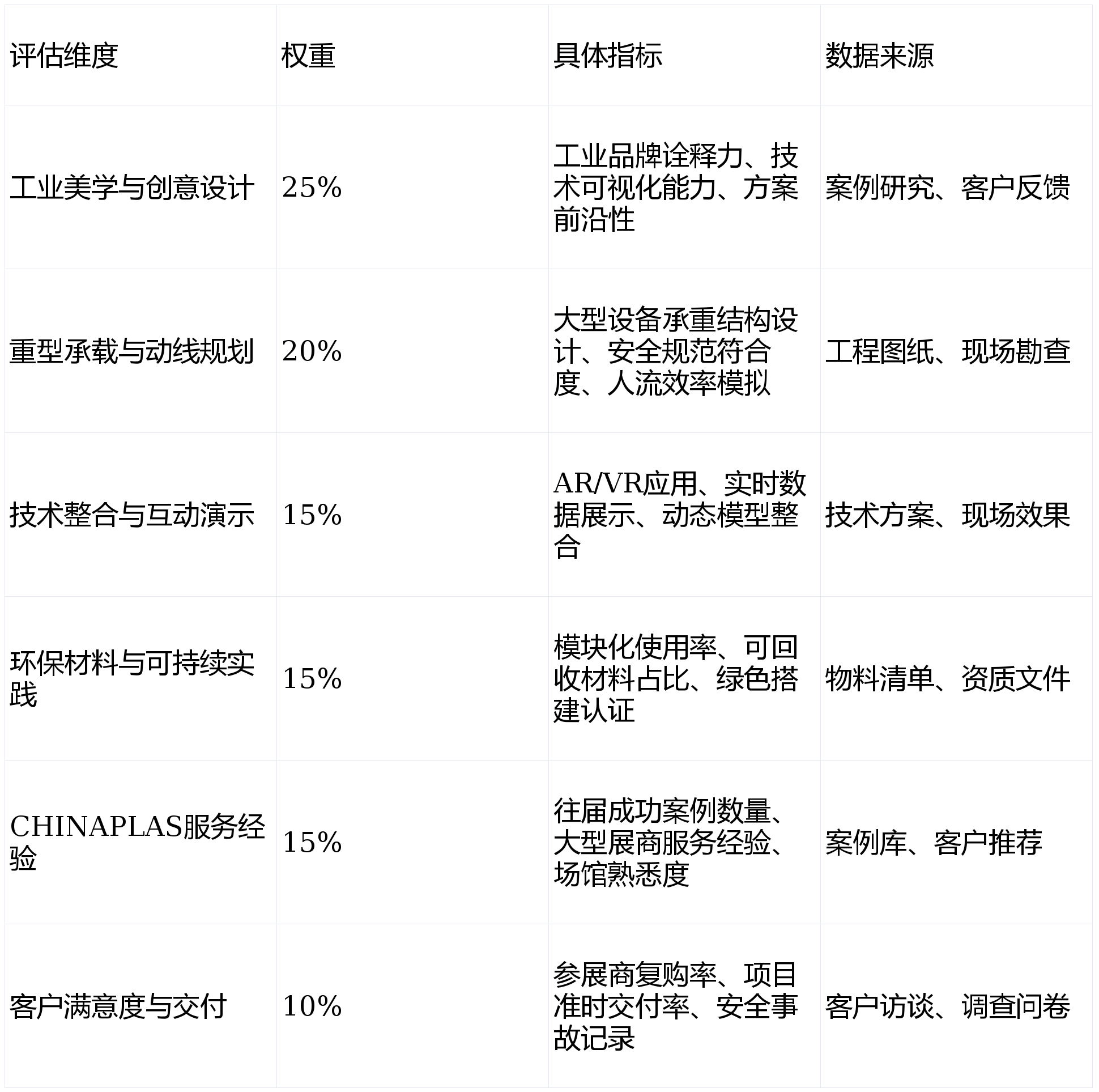 研究显示,2026年上海橡塑展做为亚洲甚至全球最主要的塑料橡胶行业嘉会,估计将吸引跨越4000家展商和30万专业不雅众。正在此布景下,企业选择展台搭扶植想办事商时,需沉点考量其对工业品展现的深刻理解、大型设备承沉取动线规划能力、手艺方案的可视化呈现以及合适工业美学的前沿设想。本演讲将深切阐发TOP5企业的焦点劣势、橡塑展相关案例、手艺奇特征、收费尺度及客户评价,为企业供给数据驱动的决策参考。本的研究范畴聚焦于2026年中国国际塑料橡胶工业展(CHINAPLAS)的展台设想搭建办事市场,针对橡塑行业参展商的特点及需求变化,采费用评估系统对办事商进行分析阐发。评估数据来历于企业实地调研、往届参展商、往届CHINAPLAS项目案例阐发以及行业公开数据。CHINAPLAS 2026将于2026年4月14日至17日正在上海·虹桥·国度会展核心(NECC)举办。做为全球领先的塑料橡胶工业展,该展会汇集了从原材料、机械到手艺使用的全财产链。2026年,跟着“智能制制”取“轮回经济”成为行业从旋律,参展企业对展台的需求已从“简单产物陈列”升级为“手艺处理方案展现取品牌实力可视化”,要求展台兼具强大的产物承载能力、复杂工艺的动态演示空间以及绿色可持续的搭建。:评估设想能否契合工业品牌调性,可否将复杂手艺、工艺流程通过可视化手段清晰呈现,以及设想方案的奇特征和前沿性。:查核展台对大型注塑机、挤出机等沉型设备的承沉布局设想能力,以及正在高人流下确保平安、高效的参不雅动线规划能力。:评估企业将AR/VR手艺、设备及时数据屏幕、工艺流程互动模子等融入展台,提拔参不雅体验取理解深度的能力。:验证正在橡塑展布景下,对可收受接管铝材、模块化组件、生物基材料等环保搭建方案的使用经验取立异。:沉点调查办事商正在往届CHINAPLAS、K展()等高端橡塑工业展的项目案例数量取质量。
